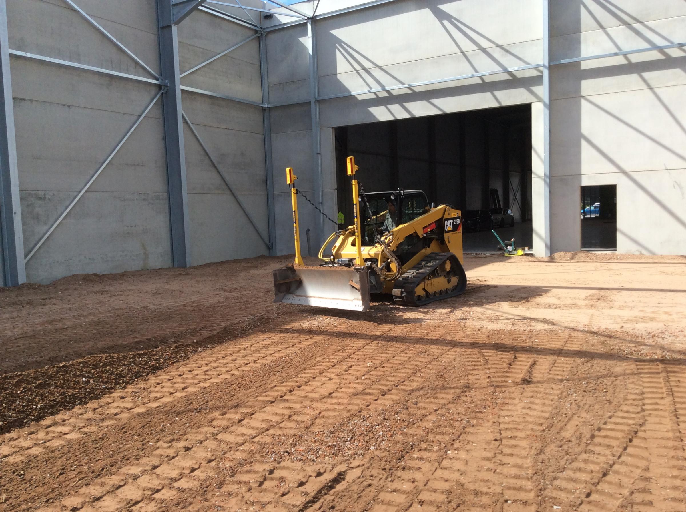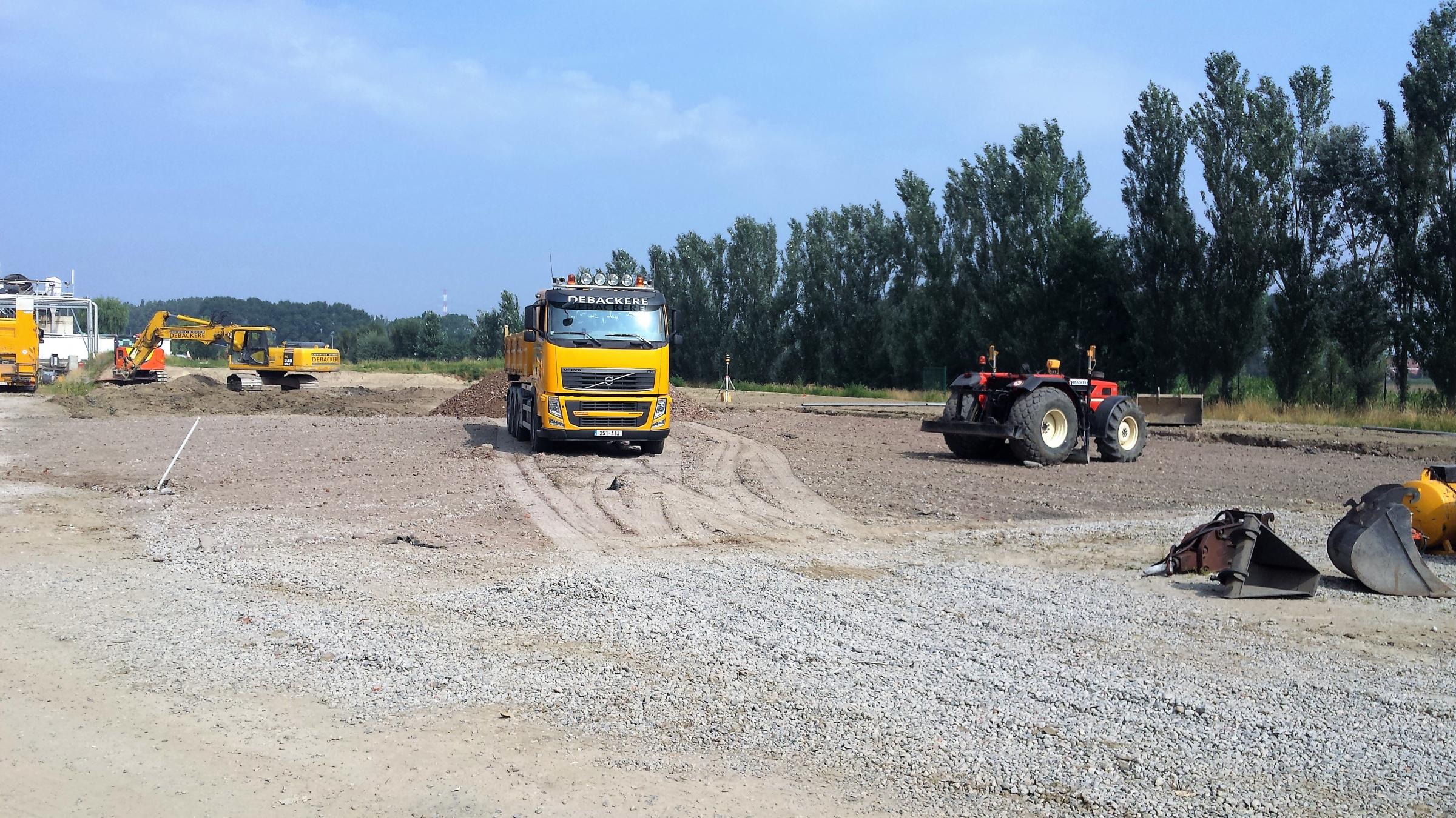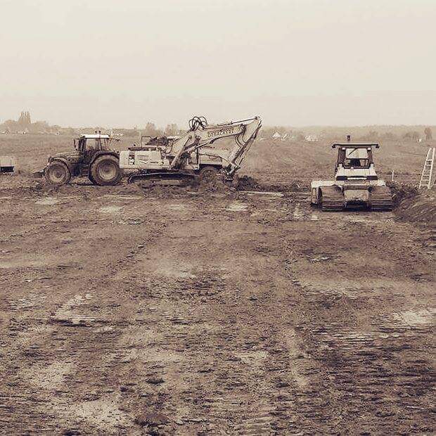 Nivelleren van grond met nivelleerplaat, bobcat of bulldozer. Dit kan zowel buiten voor grote oppervlaktes als binnen voor serres of loodsen te nivelleren.
